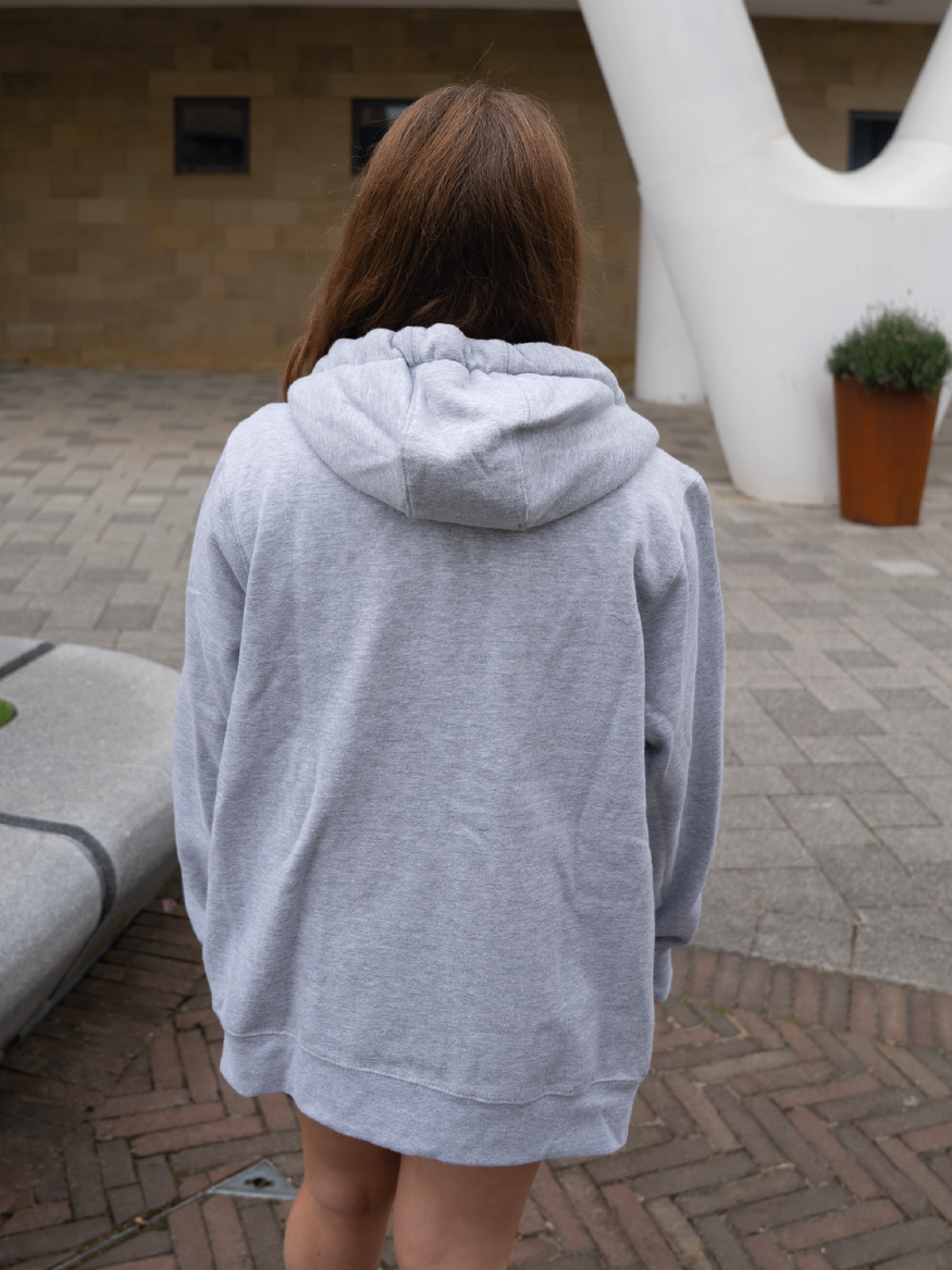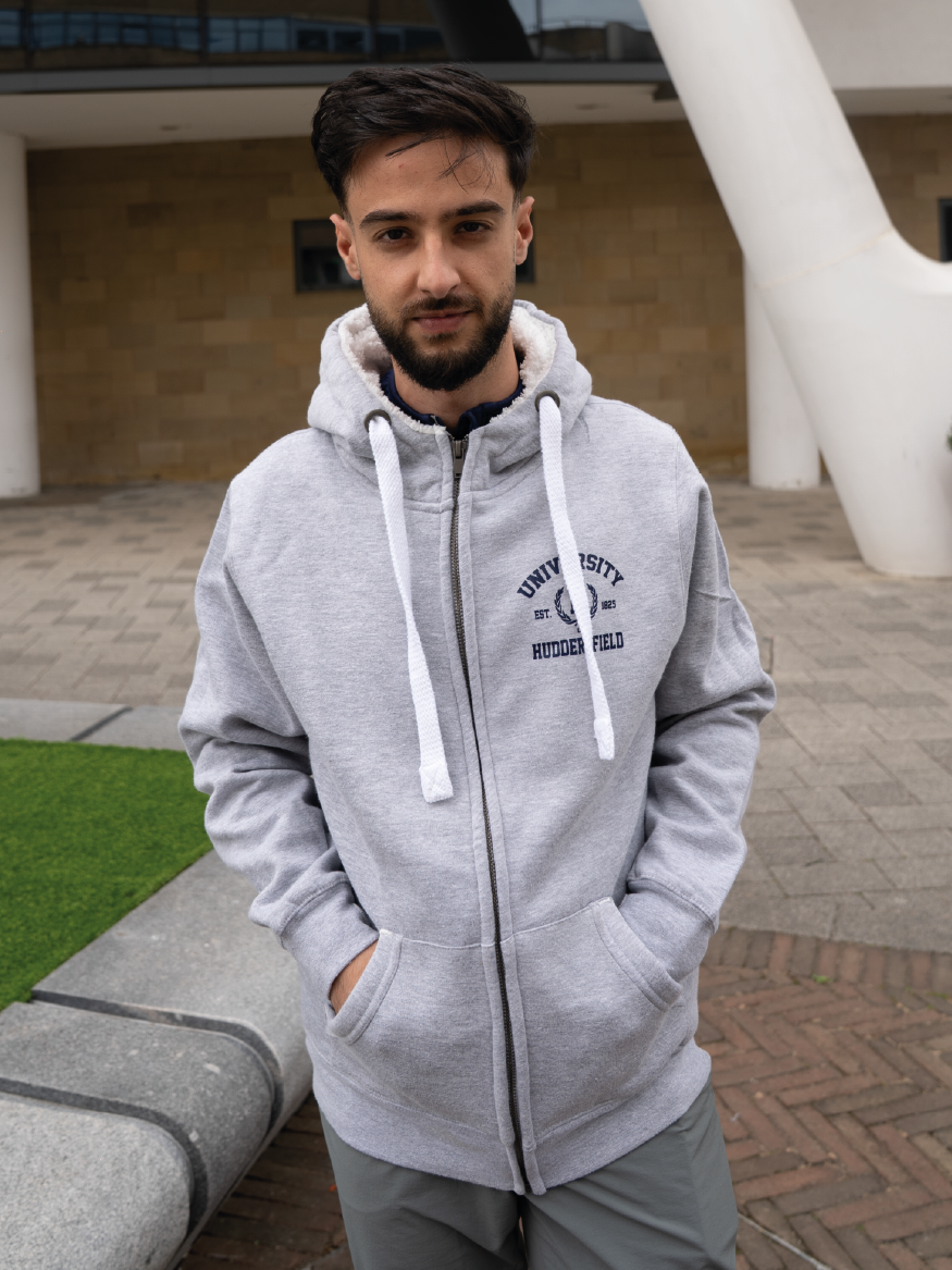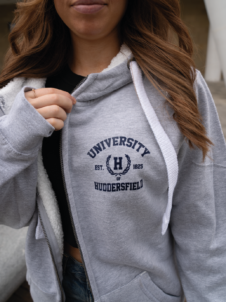 A Zip up fleece hoodie with a small university of Huddersfield logo